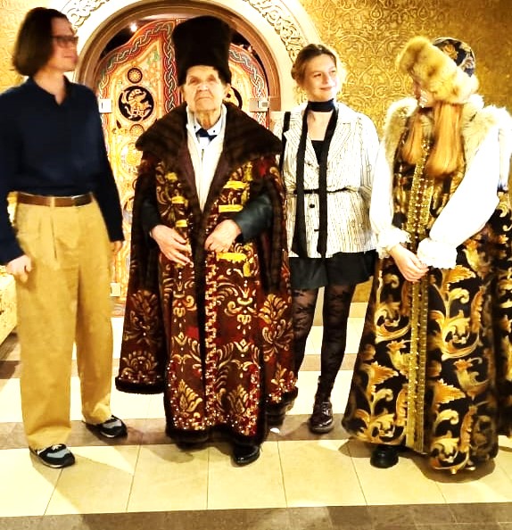 На фото: Профессор Валентин Васильевич Ворошилов в день празднования своего 90-летия со студентами. В знак особого почтения мэтра облачили в боярские одежды. И боярыня, конечно, рядом.